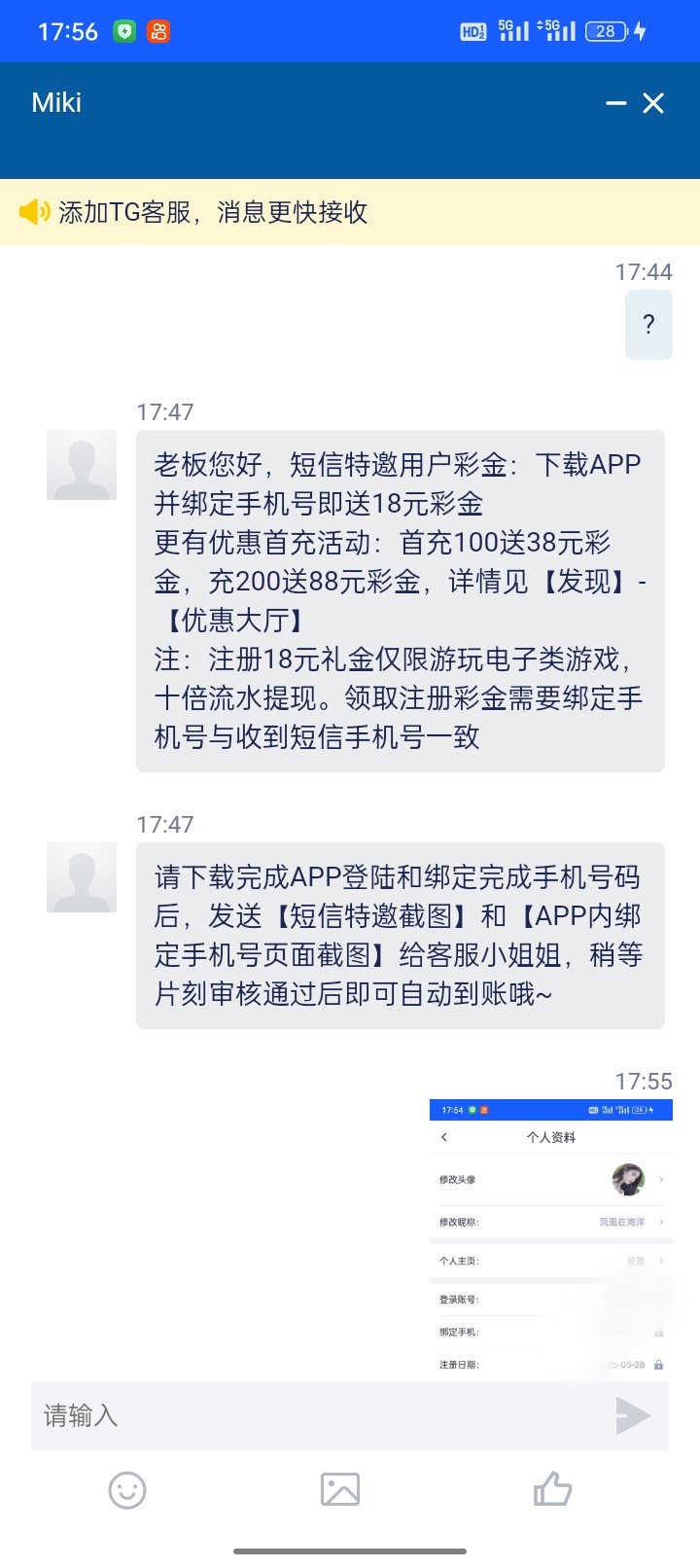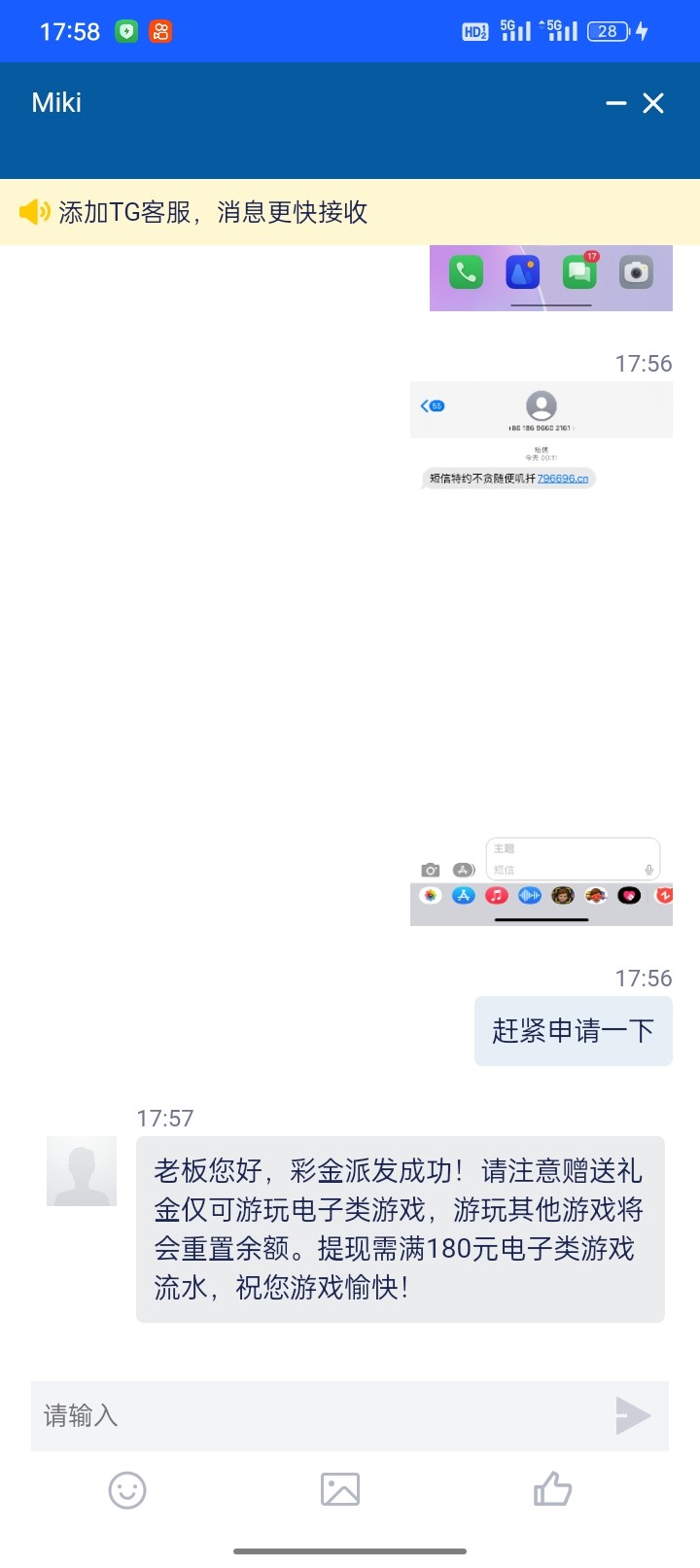 特邀碰瓷:收到短信的注册联系在线客服申请18彩金 查手机号有短信的去